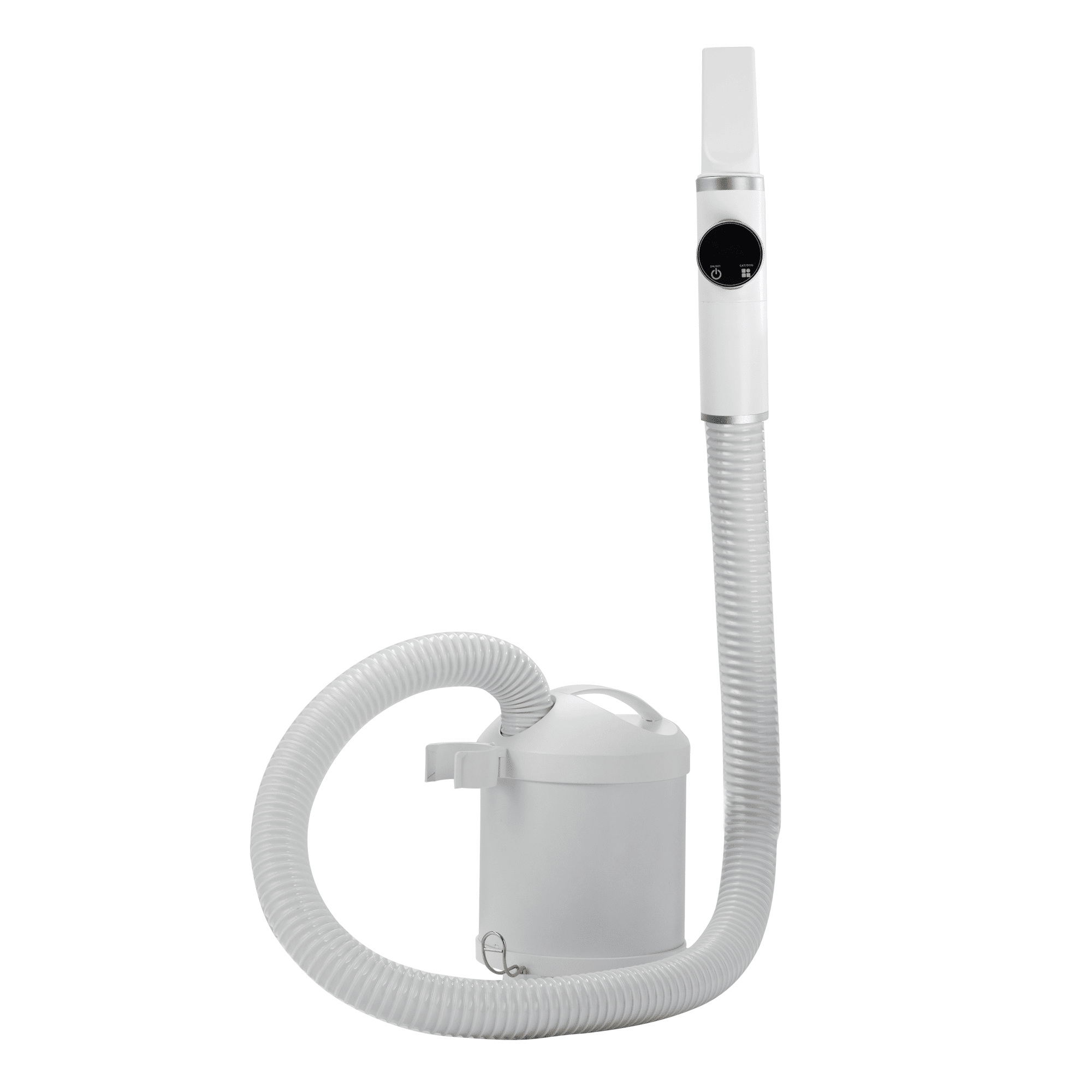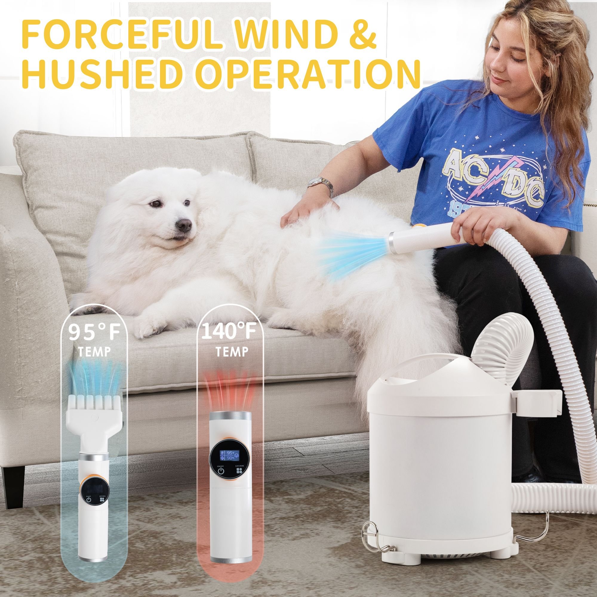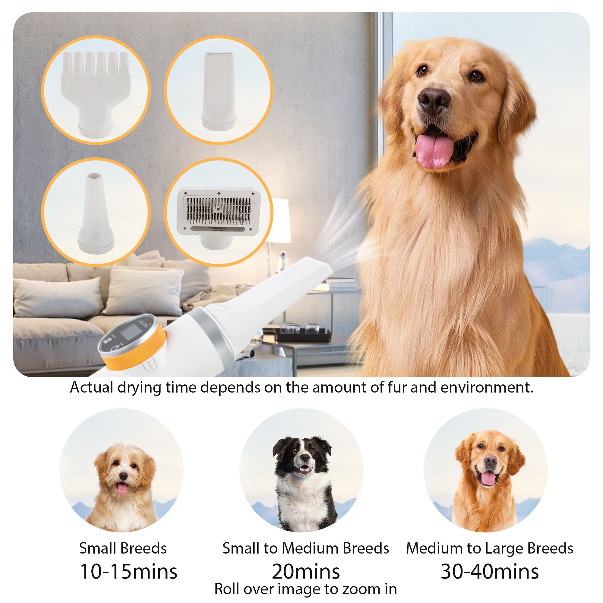 Features: [Safety Assured, Care Continuous]: Crafted with leak-proofing, anti-scald and temperature control features for further safety. The waterproof, slip-resistant base provides a stable operation. The handle's integrated heating system remains cool, peaking at 113°F for a reassuring drying.[Advanced LED Panel]: The smart LED display presents data with clarity, offering 17 distinct wind speeds from 55 to 280 MPH and a temperature range of 95°F to 140°F, allowing for precise customization of your pet's ideal drying environment.[Powerful and Swift Groomer]: Equipped with a 1600W motor which makes the dryer show robust airflow, drying a full-grown Labrador in under 19 minutes. Plus, it releases 80 million negative ions to eliminate static, preserving your pet's coat in a soft, fluffy and shiny state.[Smart Switching]: This pet blower features effortlessly switchable diverse modes for both dogs and cats. It comes with 4 specialized nozzles, catering to the grooming requirements of various pets and hair types, simulating a salon experience at home![Quiet Operation for Comfort]: Engineered with advanced ultra-quiet and shock-absorbing features, this dryer operates at a quiet 61-71 dB, ensuring pets remain calm without fear of loud noises, making you and your pet bask in the harmonious and cozy atmosphere. Specifications: Color: WhiteMain Material: Steel + ABS + PVCOverall Dimensions: 7.28"(L) x 7.28"(W) x 9.06"(H)Maximum Wind Speed: 35m/sTemperature Range: 95°F - 140°FRated Power: 1600WRated Voltage: 110VNet Weight: 6.17lbs
