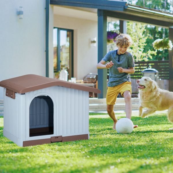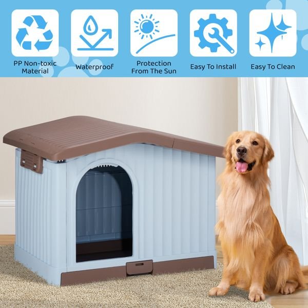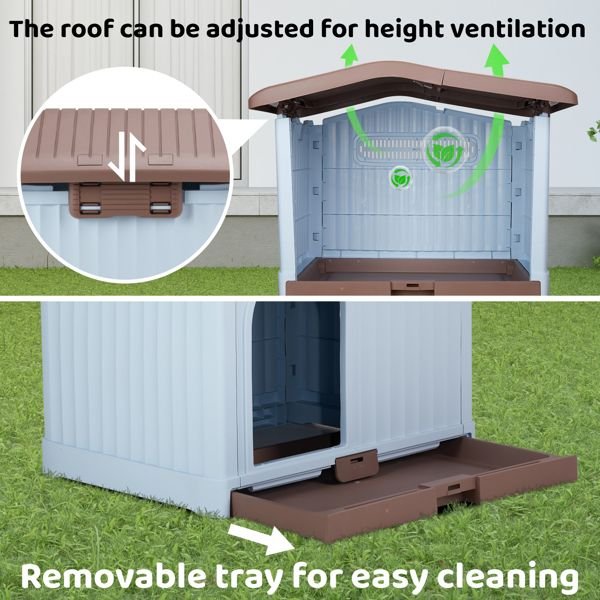 34 inch Large Plastic Dog House with Liftable Roof, Indoor Outdoor Doghouse Puppy Shelter with Detachable Base and Adjustable Bar Window