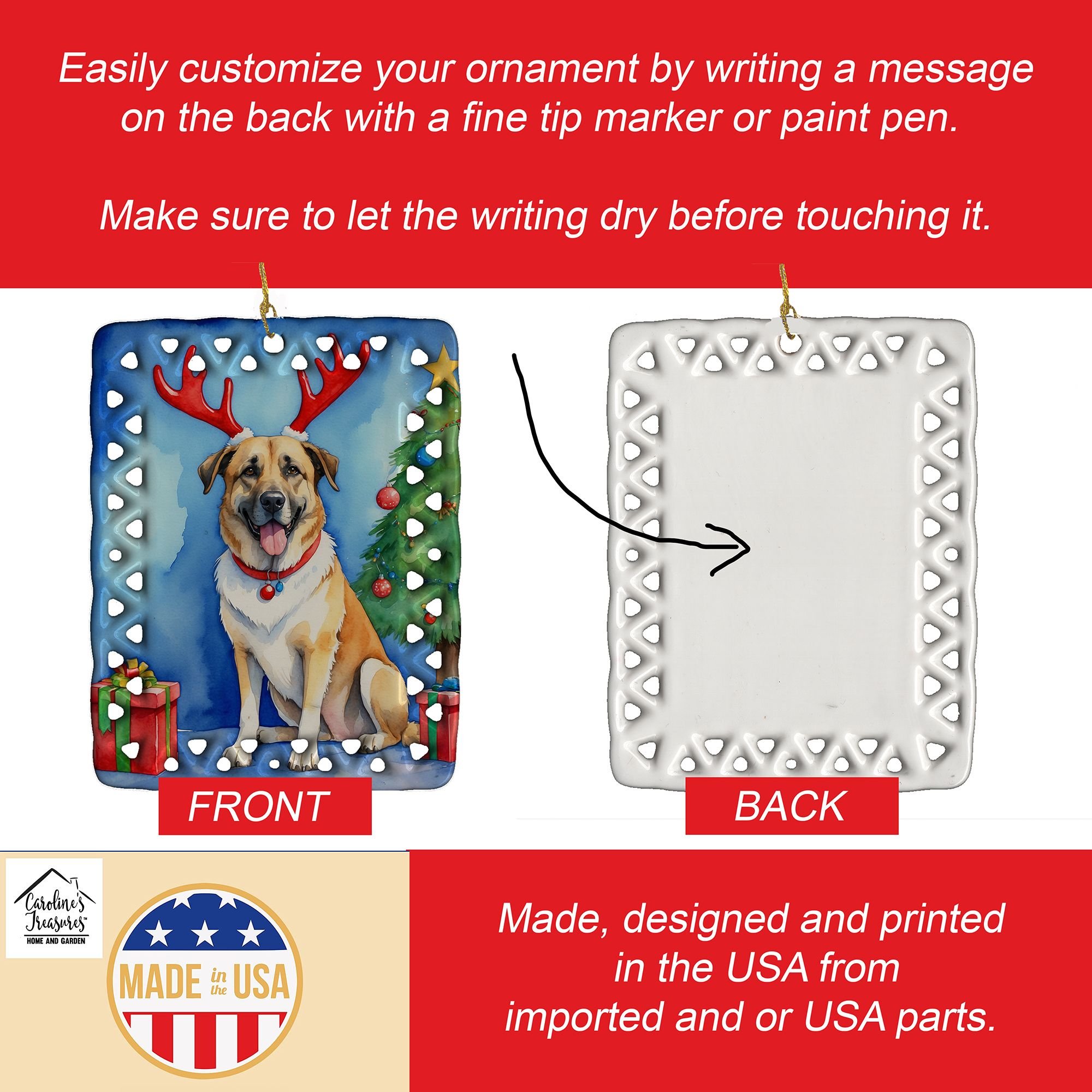 Porcelain Ornament featuring breed specific Anatolian Shepherd Dog artwork. Celebrate Christmas with this Christmas Ornament. Add a unique, personal touch to your holiday decor with our Rectangular Lattice Porcelain Ornament. Perfect for creating cherished memories, this high-quality ornament shines under festive lights, reflecting warmth and joy throughout your Christmas tree. Crafted with a glossy finish, it showcases vibrant, full-color artwork contributed by our talented artists, ensuring your tree is adorned with a burst of color and holiday spirit. What sets this Porcelain Ornament apart is its customizable white back. Use a paint pen or permanent marker to write a heartfelt message, commemorate a special year, or mark an unforgettable date, turning this ornament into a keepsake that will be treasured for years to come. For best results, allow any personalization to dry thoroughly before handling. Each ornament comes complete with a delicate gold cord, making it easy to hang and display. Proudly made in the USA, this ornament measures 3.375 x 2.625 inches and is a thoughtful gift for pet sitters, teachers, family members, or anyone who would appreciate a little extra holiday magic. Bring style, charm, and a touch of personal meaning to your Christmas tree with this beautifully designed ornament..