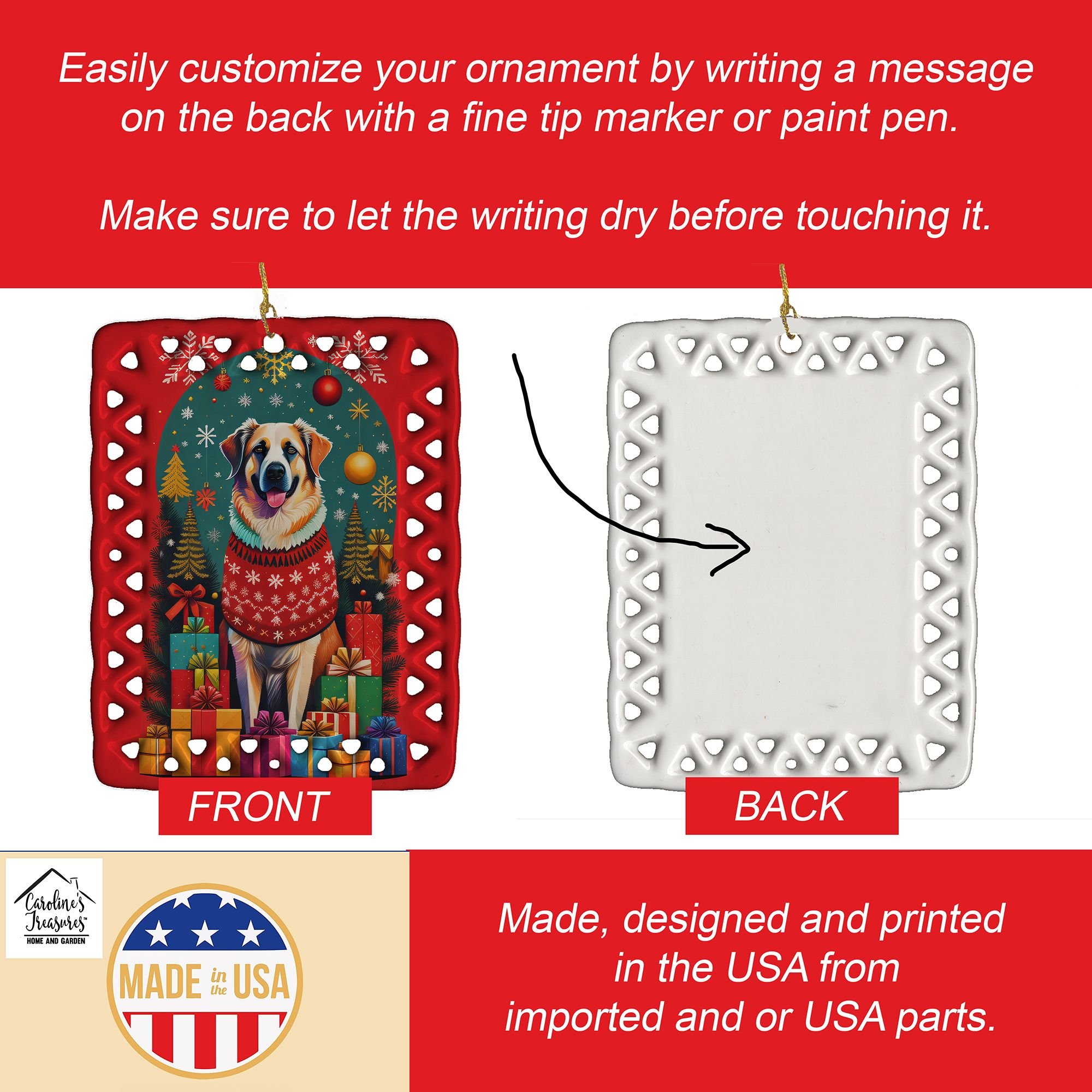 Porcelain Ornament featuring breed specific Anatolian Shepherd Dog artwork. Celebrate Christmas with this Christmas Ornament. Add a unique, personal touch to your holiday decor with our Rectangular Lattice Porcelain Ornament. Perfect for creating cherished memories, this high-quality ornament shines under festive lights, reflecting warmth and joy throughout your Christmas tree. Crafted with a glossy finish, it showcases vibrant, full-color artwork contributed by our talented artists, ensuring your tree is adorned with a burst of color and holiday spirit. What sets this Porcelain Ornament apart is its customizable white back. Use a paint pen or permanent marker to write a heartfelt message, commemorate a special year, or mark an unforgettable date, turning this ornament into a keepsake that will be treasured for years to come. For best results, allow any personalization to dry thoroughly before handling. Each ornament comes complete with a delicate gold cord, making it easy to hang and display. Proudly made in the USA, this ornament measures 3.375 x 2.625 inches and is a thoughtful gift for pet sitters, teachers, family members, or anyone who would appreciate a little extra holiday magic. Bring style, charm, and a touch of personal meaning to your Christmas tree with this beautifully designed ornament..