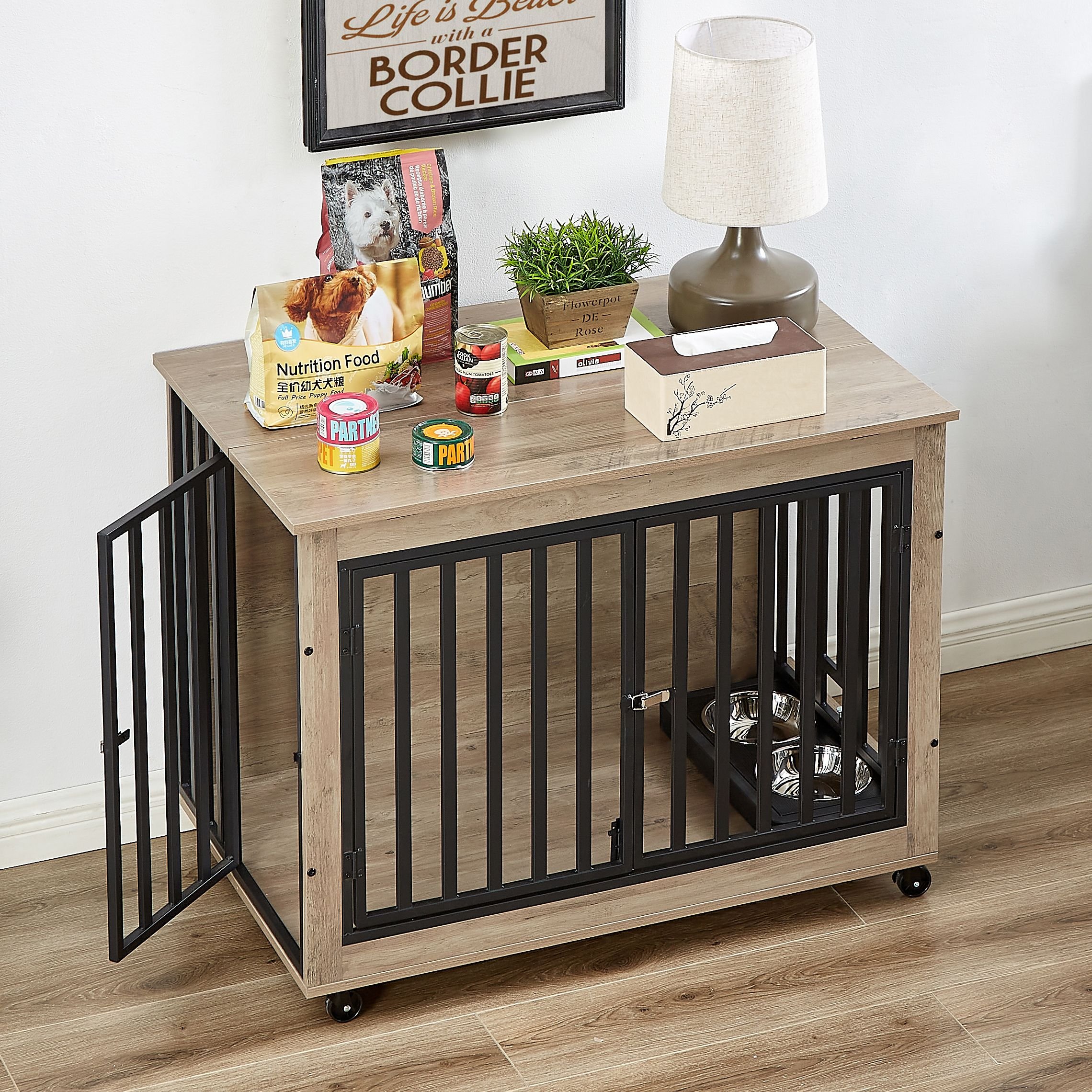 Home > Furniture Style Dog Crate Side Table With Feeding Bowl, Wheels, Three Doors, Flip-Up Top Opening. Indoor, Grey, 38.58"W x 25.2"D x 27.17"H