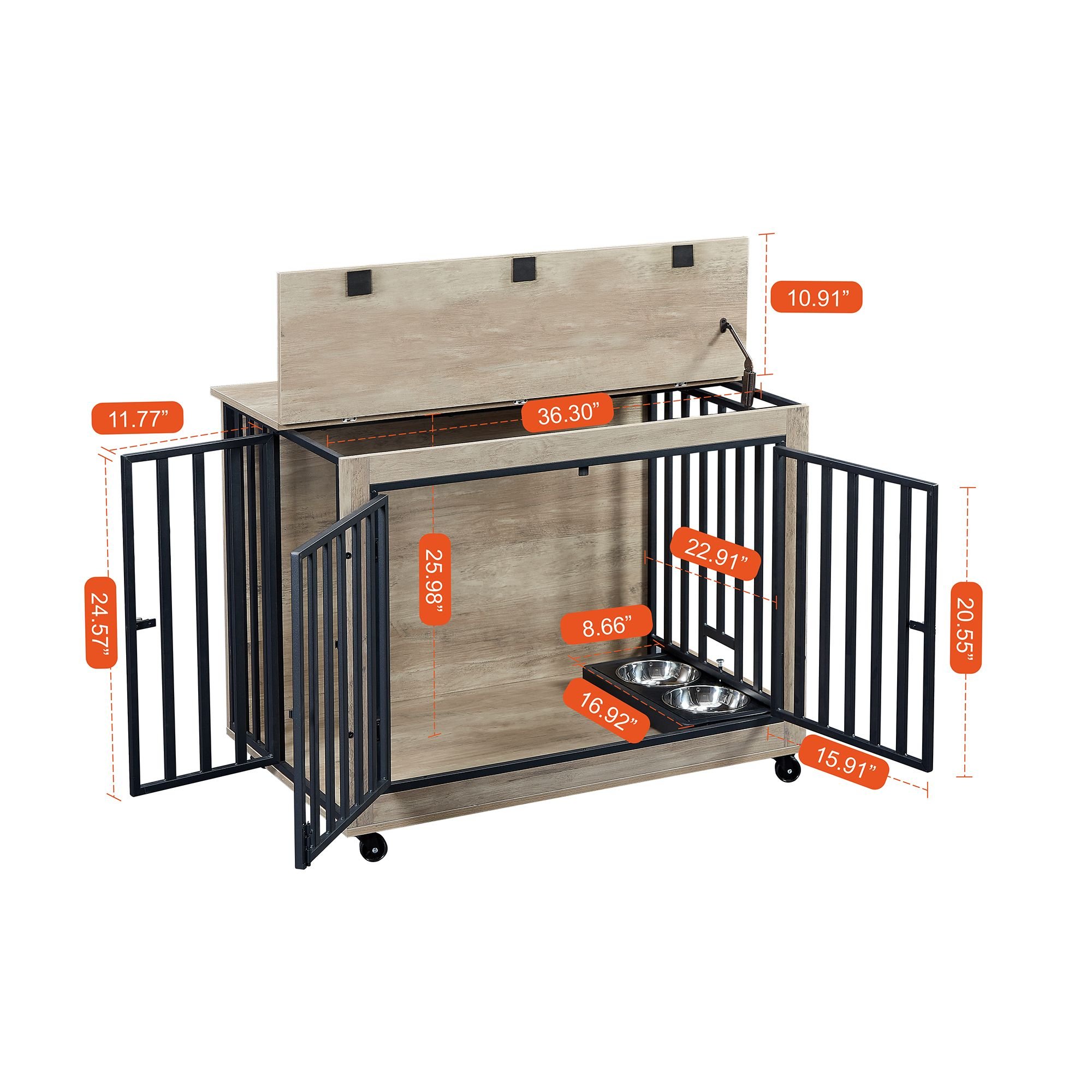 Furniture Style Dog Crate Side Table With Feeding Bowl, Wheels, Three Doors, Flip-Up Top Opening. Indoor, Grey, 38.58"W x 25.2"D x 27.17"H