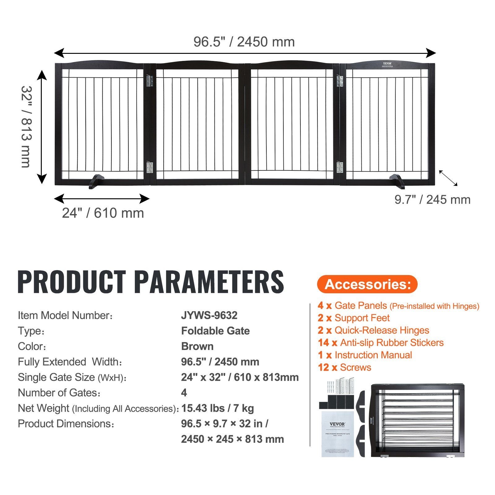 5.Product Dimensions: The fully extended width of our foldable dog gate is 96.5". A single gate panel measures 24" Wx 32"H. There are 4 panels in total.